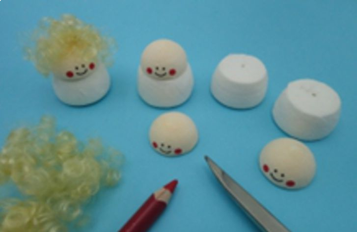 Hlavu přilepíme na válec (tělo). Vlasy rozstřihneme na 4 stejné díly. Na hlavu přilepíme rovnoměrně vlasy. Červenou pastelkou dokreslíme tváře.