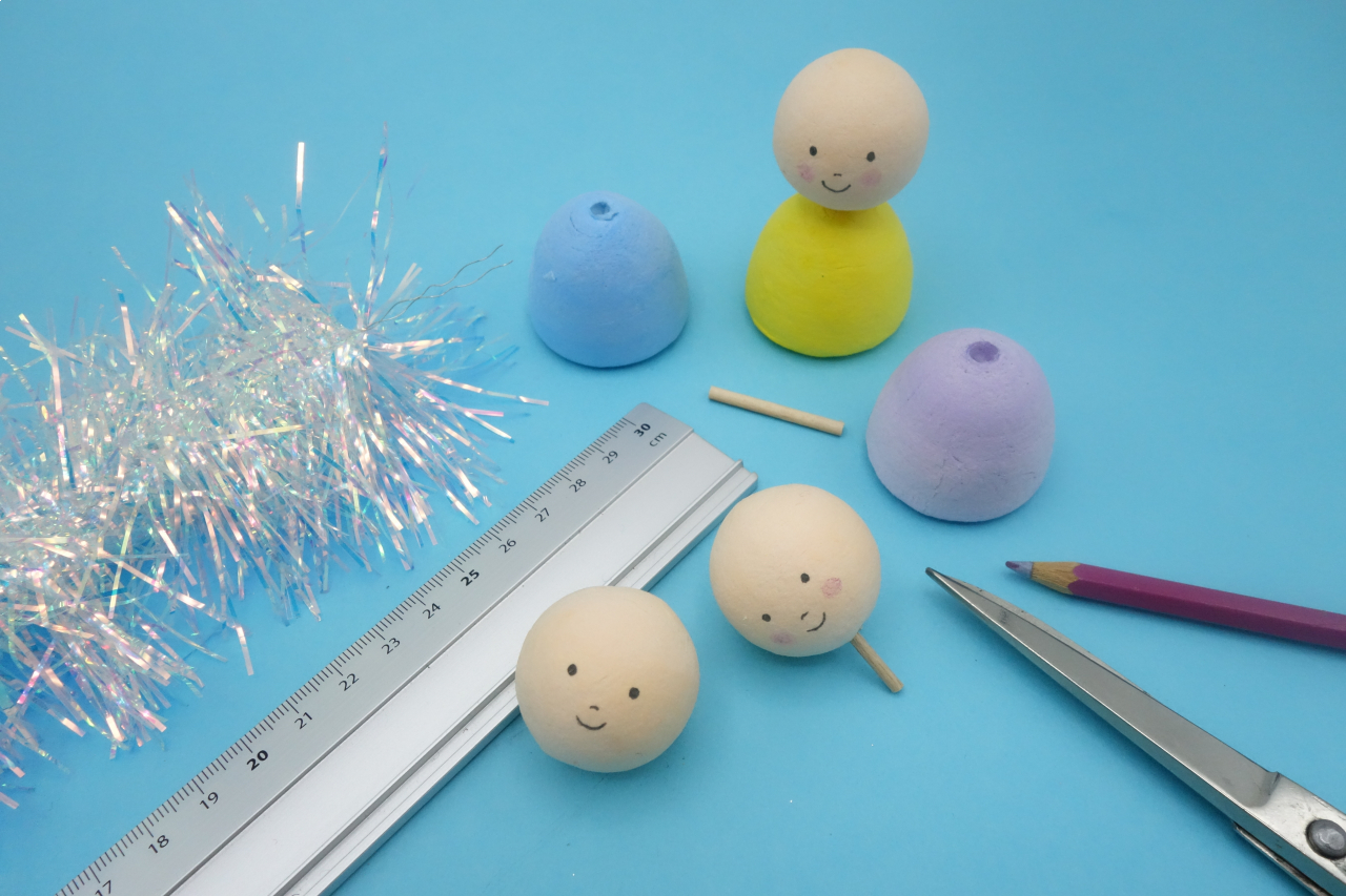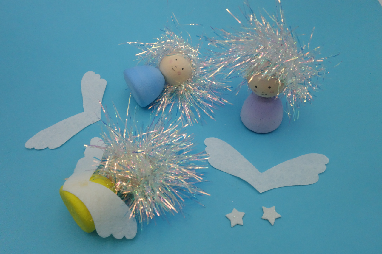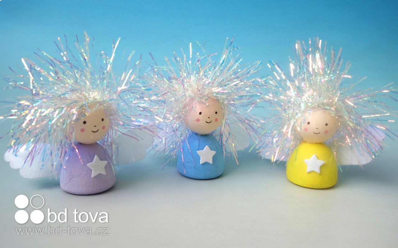 Do hlavy vlepíme špejli, hlavu přilepíme k tělu. Růžovou pastelkou dokreslíme andělům tváře. Barevný řetěz si rozstřihneme na třetiny.