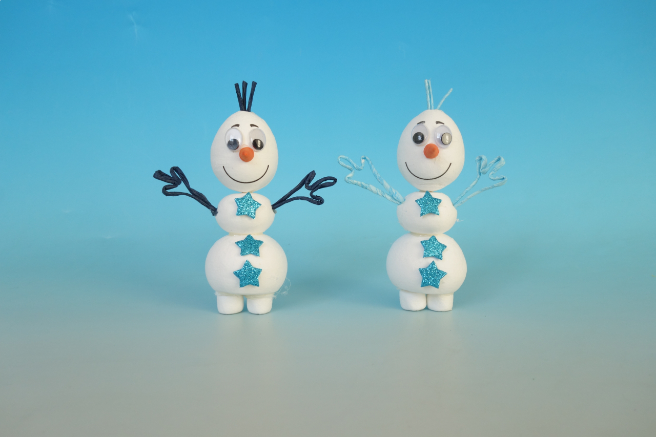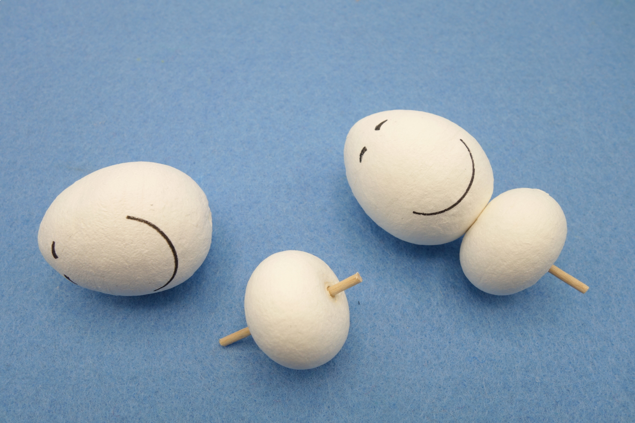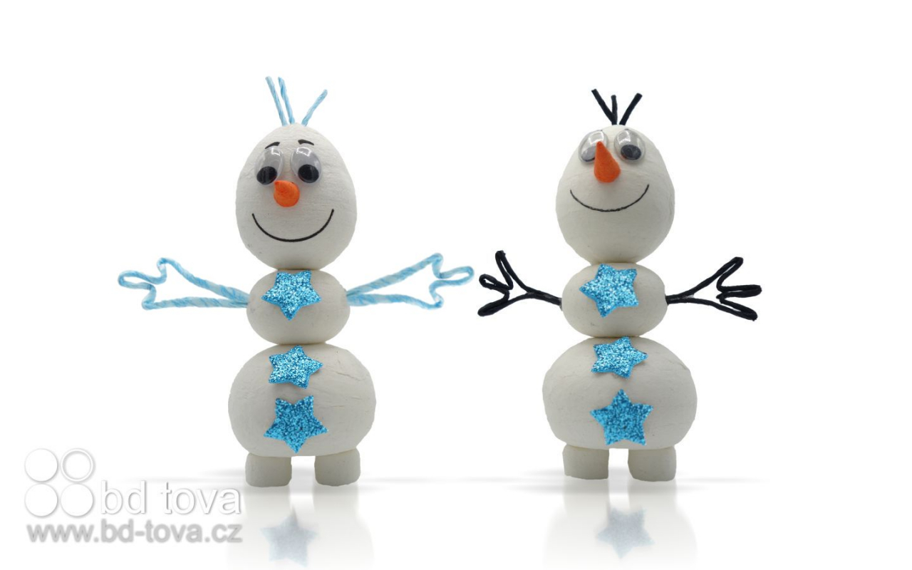 Kolečkem protáhneme špejli tak, aby na každé straně kousek vyčnívala (střed těla). Střed těla vlepíme do hlavy a spodní části těla. Do středu těla z boku nůžkami nebo hřebíkem propíchneme otvory na ruce.