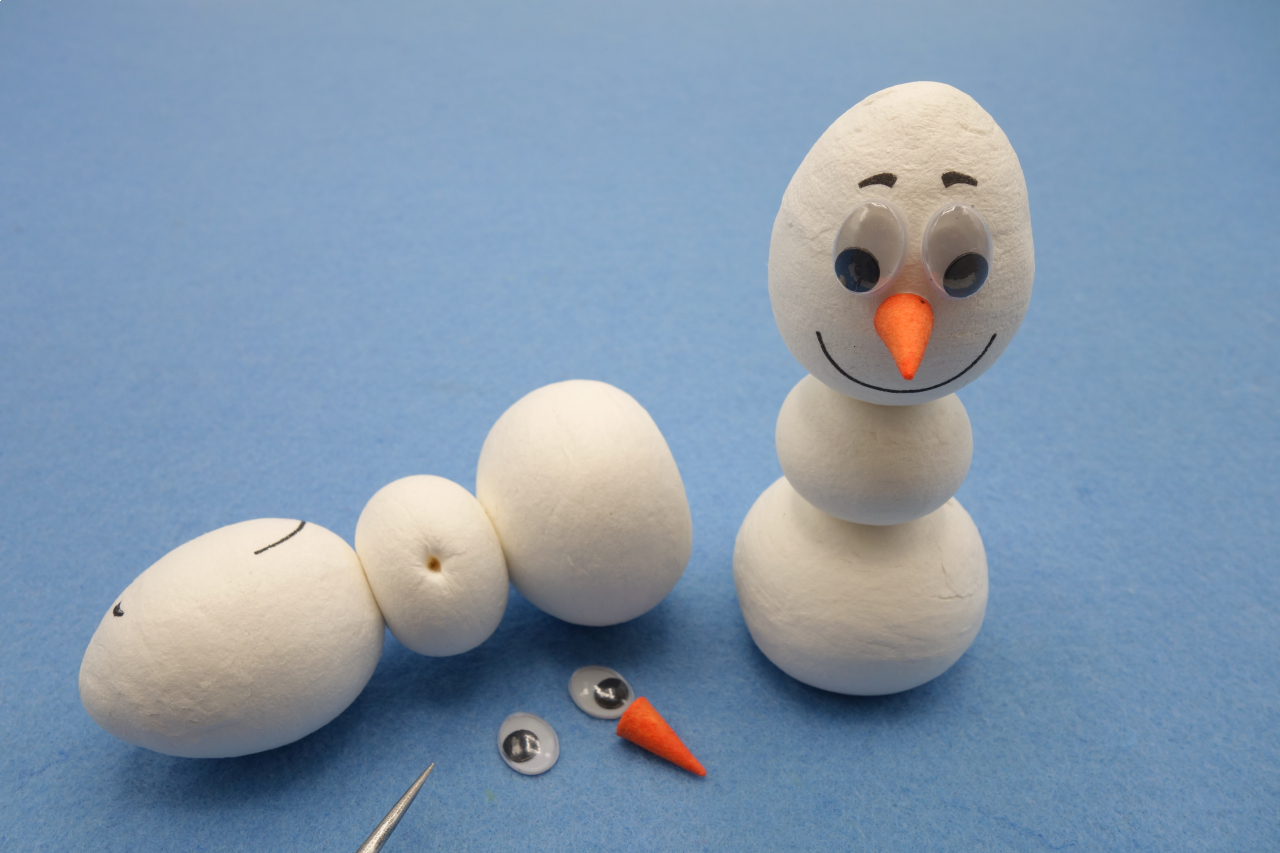 Pod obočí nalepíme oči a pod ně nos. Zespodu těla nalepíme válečky (nohy).