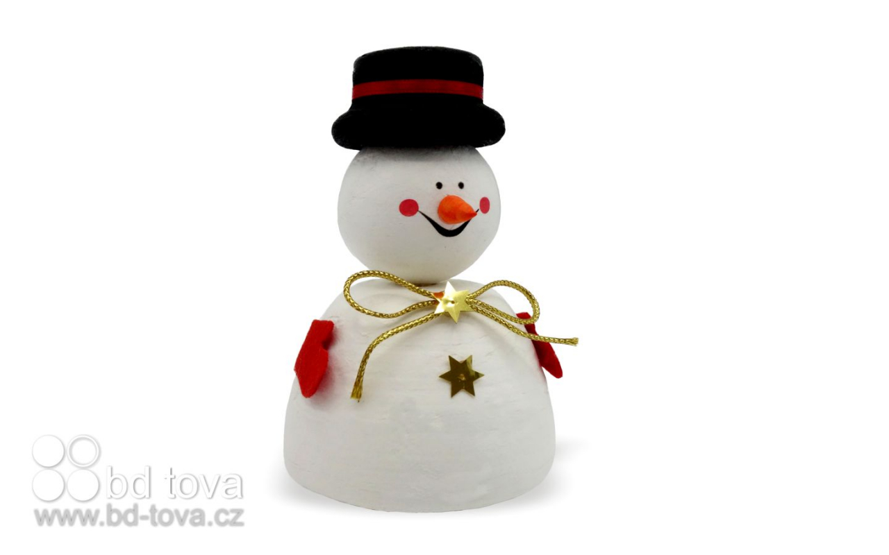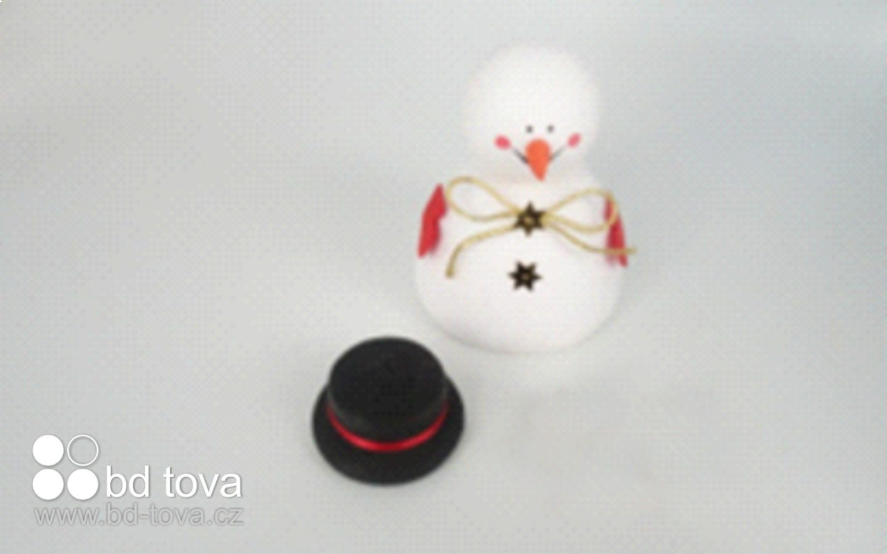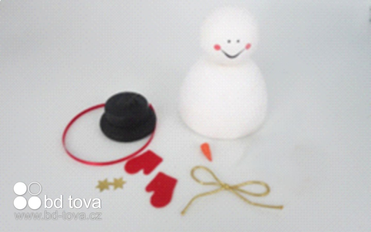 Pod oči přilepíme mrkev. Na boky těla přilepíme rukavice palci nahoru. Mašli přilepíme pod hlavu na tělo a na ni hvězdičku a pod ní druhou.