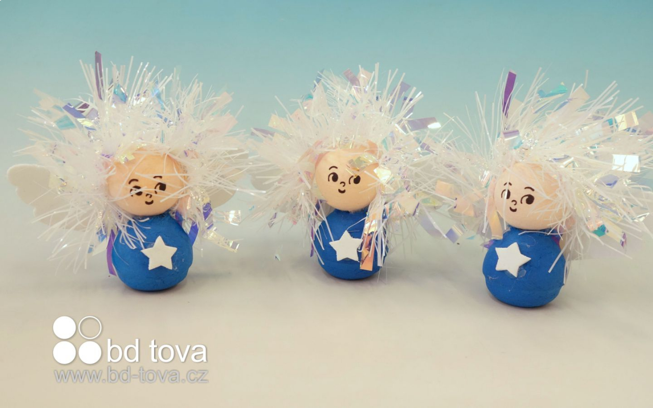 Do hlavy vlepíme špejli, hlavu přilepíme k tělu. Růžovou pastelkou dokreslíme andělům tváře. Barevný řetěz si rozstřihneme na třetiny.