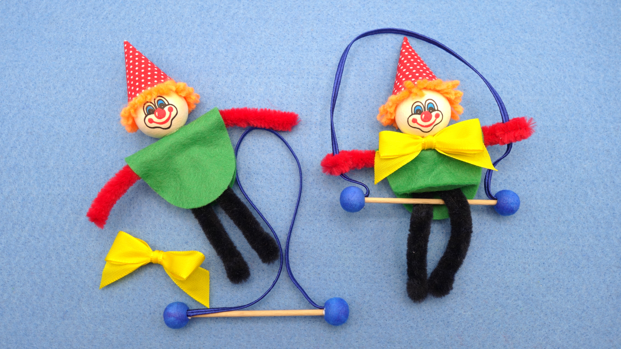 Mašličku nalepíme pod hlavu a klauna připevníme na hrazdu. Ruce obtočíme kolem šňůrky a nohy rozkročmo kolem špejle.